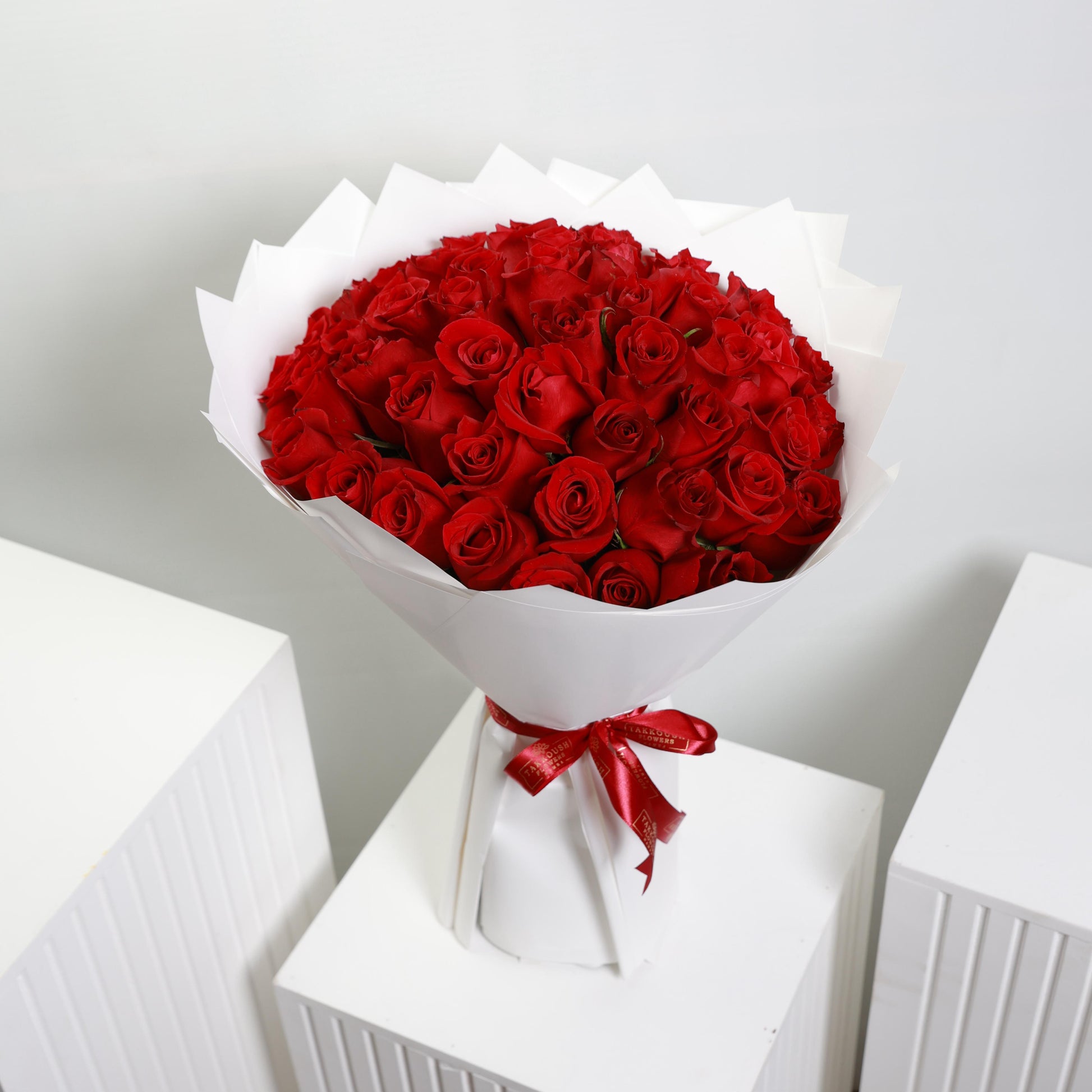 A bouquet of compacted red roses is ultimate expression of love and passion. Hand-crafted with carefully selected, large-headed red roses and arranged by hand for a rich, full look that leaves a lasting impression.
