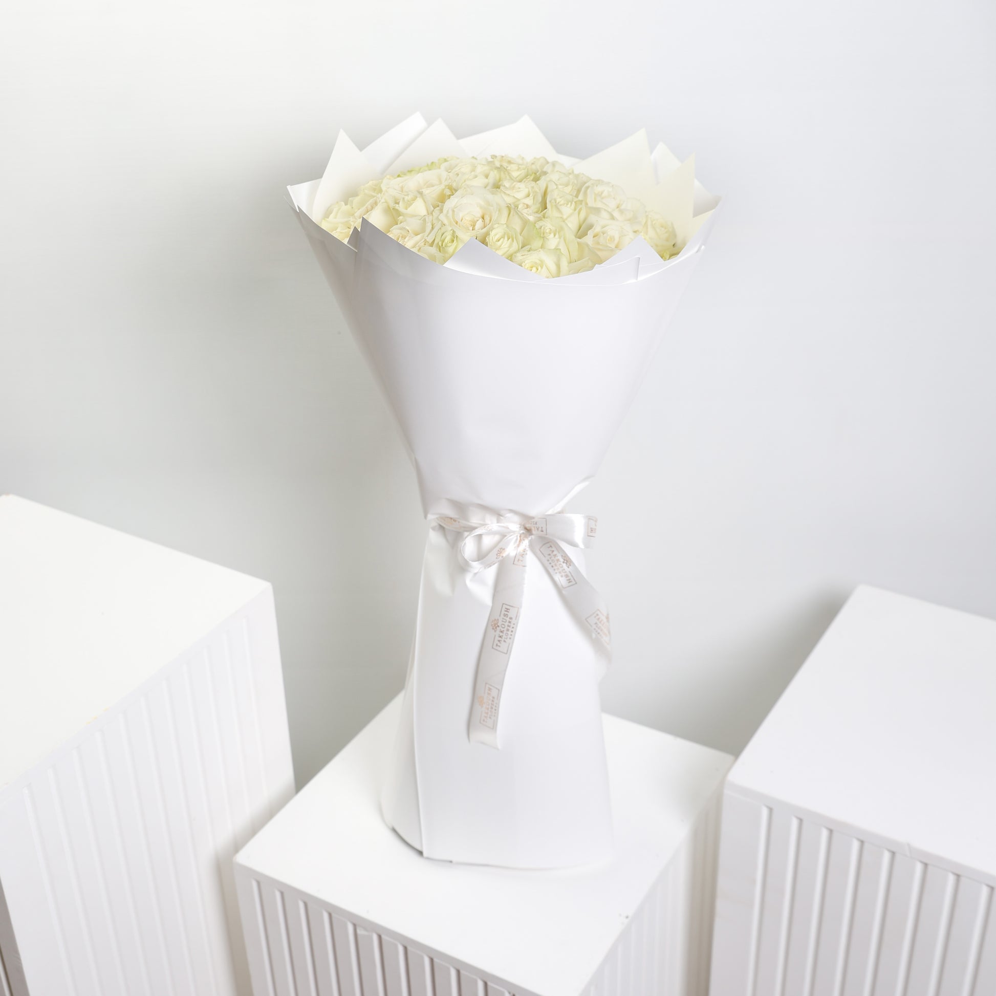 A bouquet of White Roses is the perfect expression of love. At Takkoush Flowers we hand-create each bouquet with large-headed White Roses, expertly crafted and presented in gift packaging.