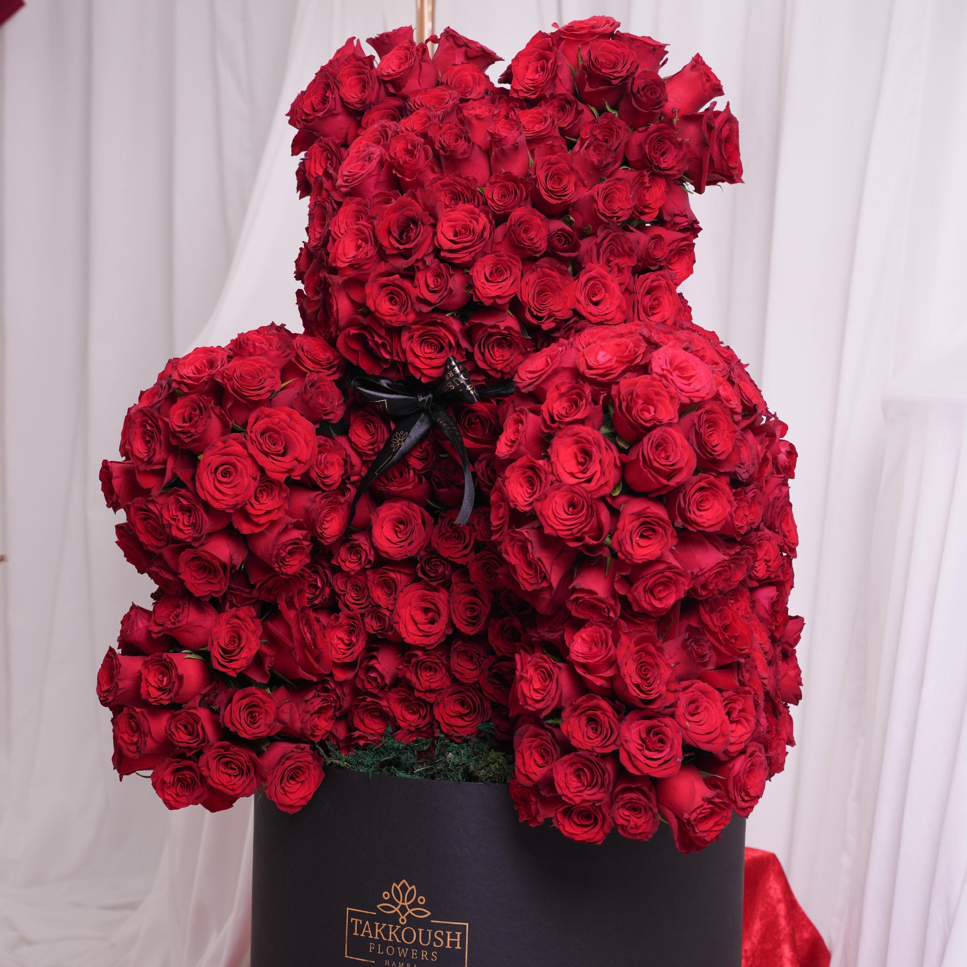 A charming teddy bear shape crafted entirely from rich red roses, creating a sweet and romantic statement. Arranged with love, it’s the perfect Valentine’s Day gift and a unique way to say “I love you.”