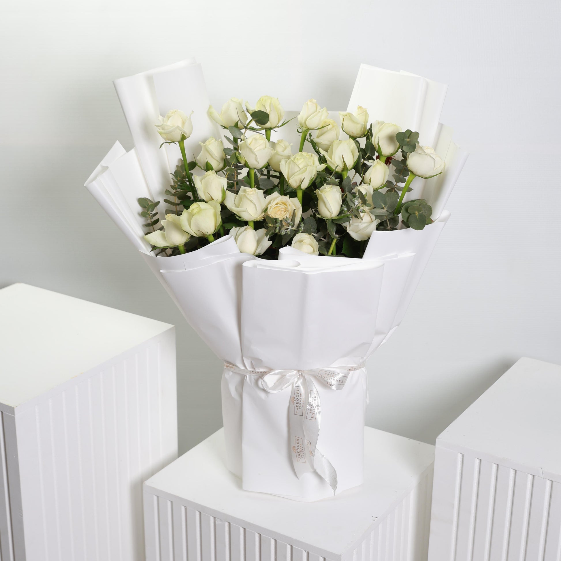 A bouquet of White Roses is the perfect expression of love. At Takkoush Flowers we hand-create each bouquet with large-headed White Roses and greenery, expertly crafted and presented in gift packaging.